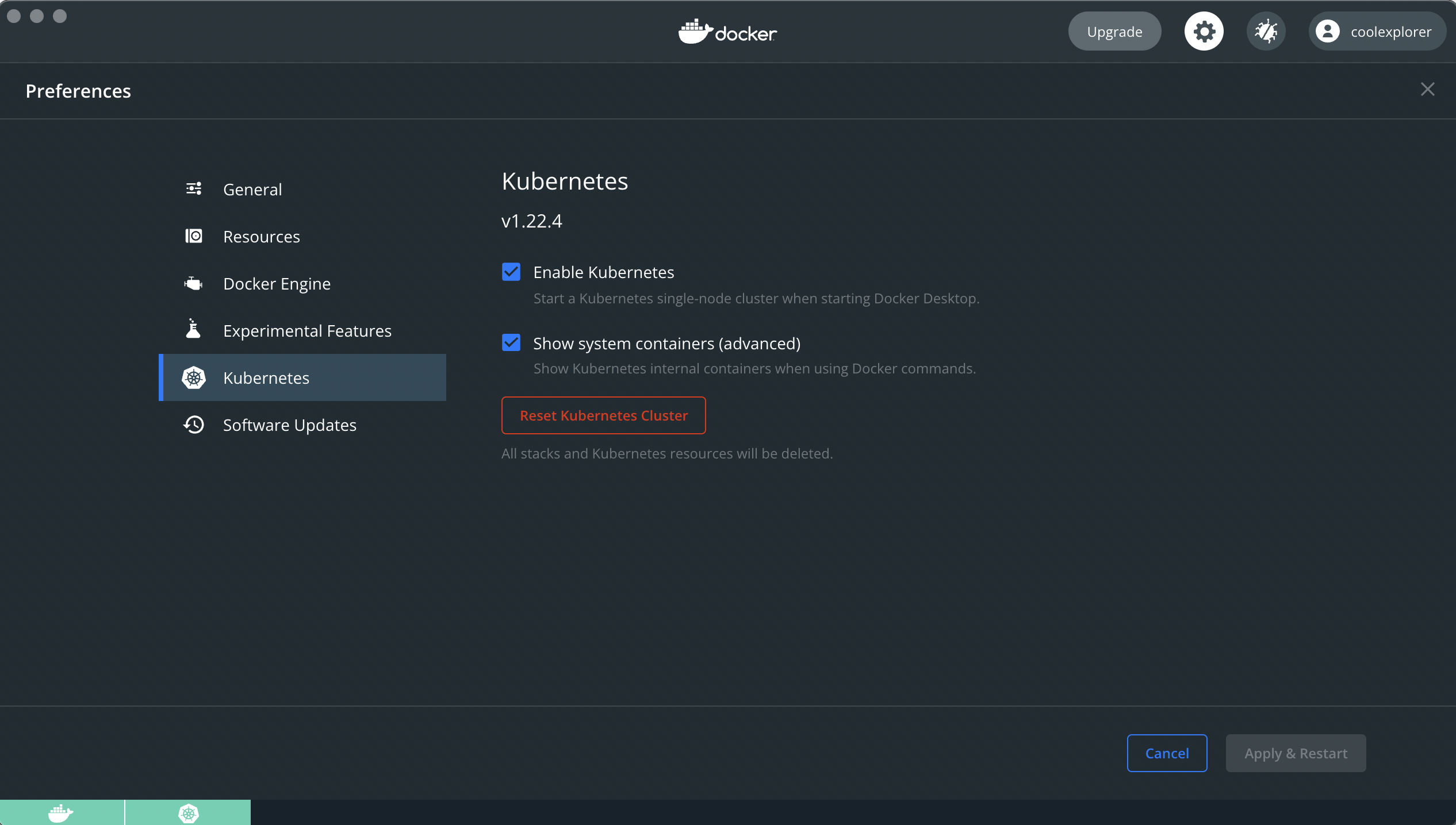 Settings 메뉴로 들어가면 Kubernetes Menu가 보인다. 클릭해보자.